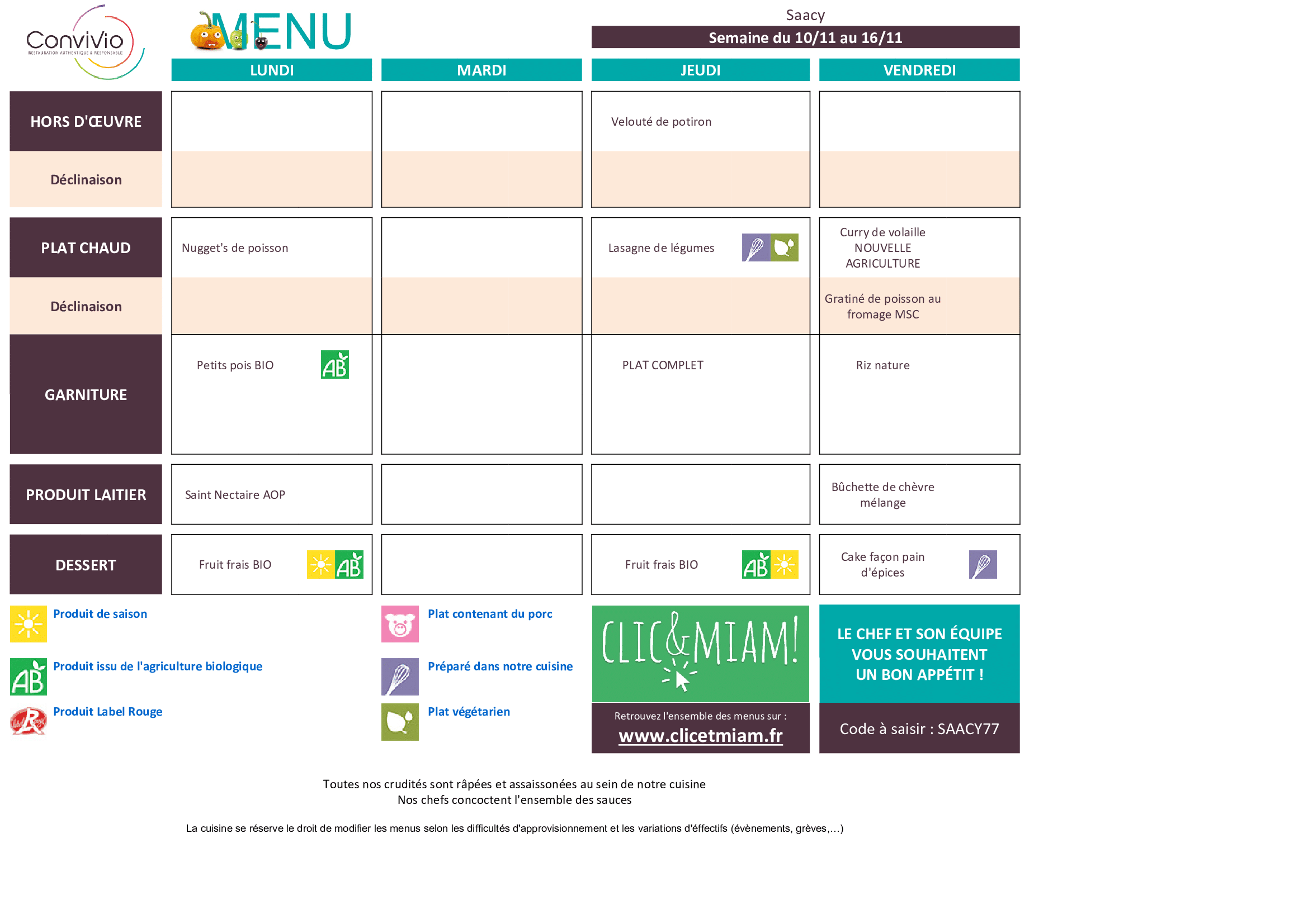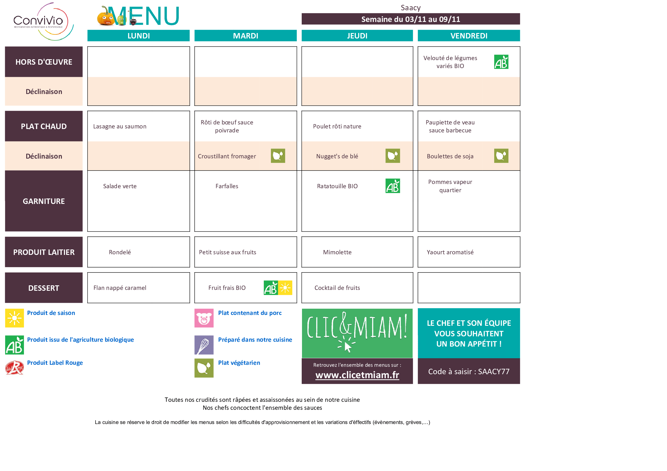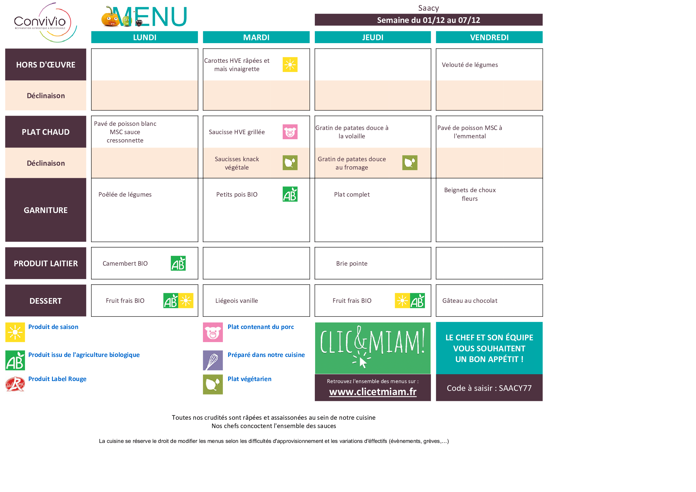Menu de la restauration scolaire